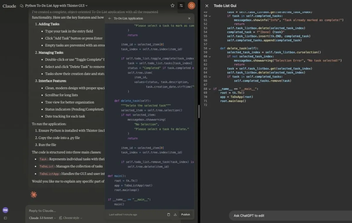 در مقایسه ChatGPT و Claude در کدنویسی هر دو الزامات را دقیقاً برآورده کردند. هر دو مورد به تمام نیازهای من از اپلیکیشن پاسخ داده و آنها را برطرف کردند؛ با این حال کد ChatGPT تنها ۷۲ خط بود، در حالی که Claude از ۲۰۷ خط تشکیل شده بود. اگر قرار بود قضاوت من تنها بر اساس کد باشد، باید میگفتم کد Claude بهتر بوده، چراکه در مستندسازی و قابلیت استفاده دوباره از کد بهتر عمل کرده است، اما قضاوت من تنها بر این اساس نخواهد بود.