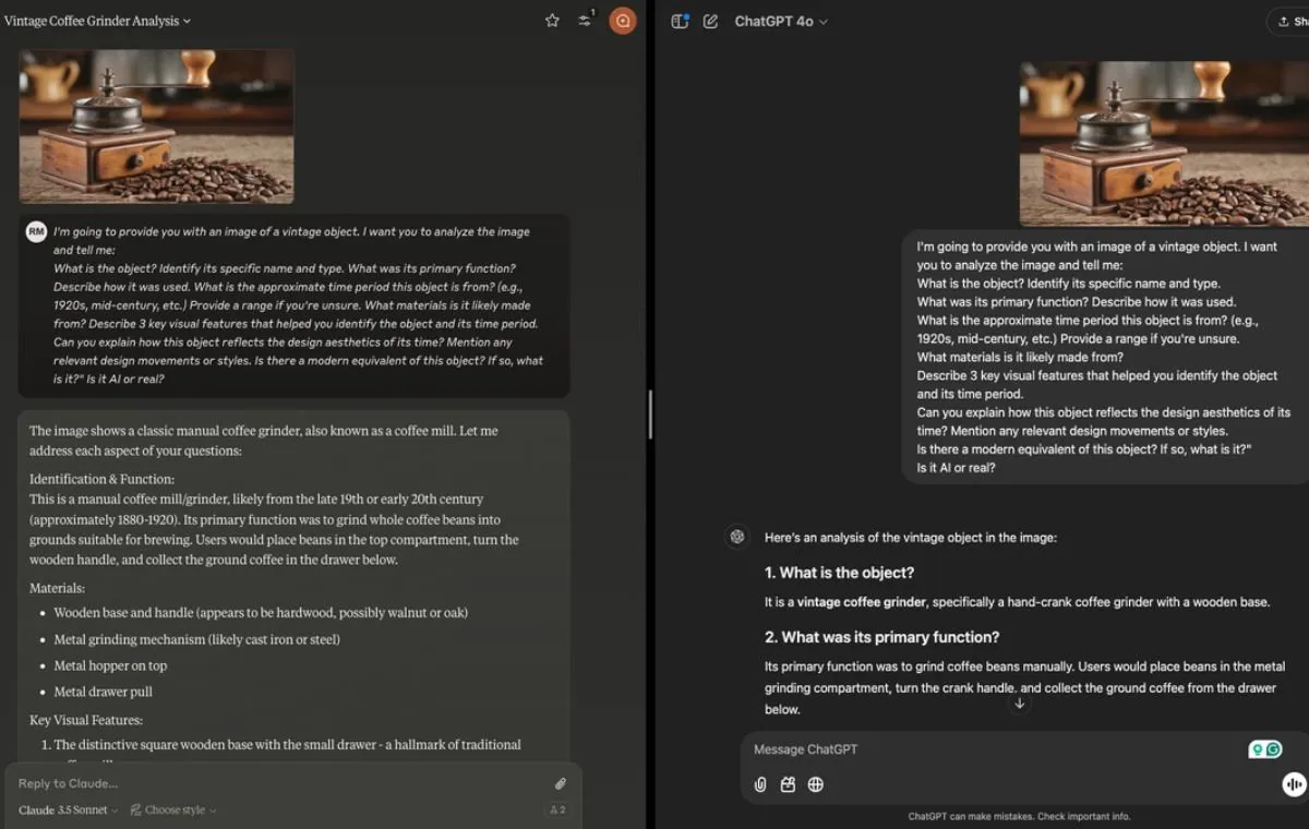 در اینجا همانطور که در تصویر بالا هم میبینید، تصویری از یک آسیاب دستی و قدیمی قهوه که در Ideogram ساختهام را به هر دو آنها میدهم. حال برای مقایسه ChatGPT و Claude هر کدام از آنها باید این شیء را شناسایی کرده، بگویند چگونه کار میکند، از کجا آمده و اینکه آیا واقعی است یا توسط هوش مصنوعی ساخته شده است.