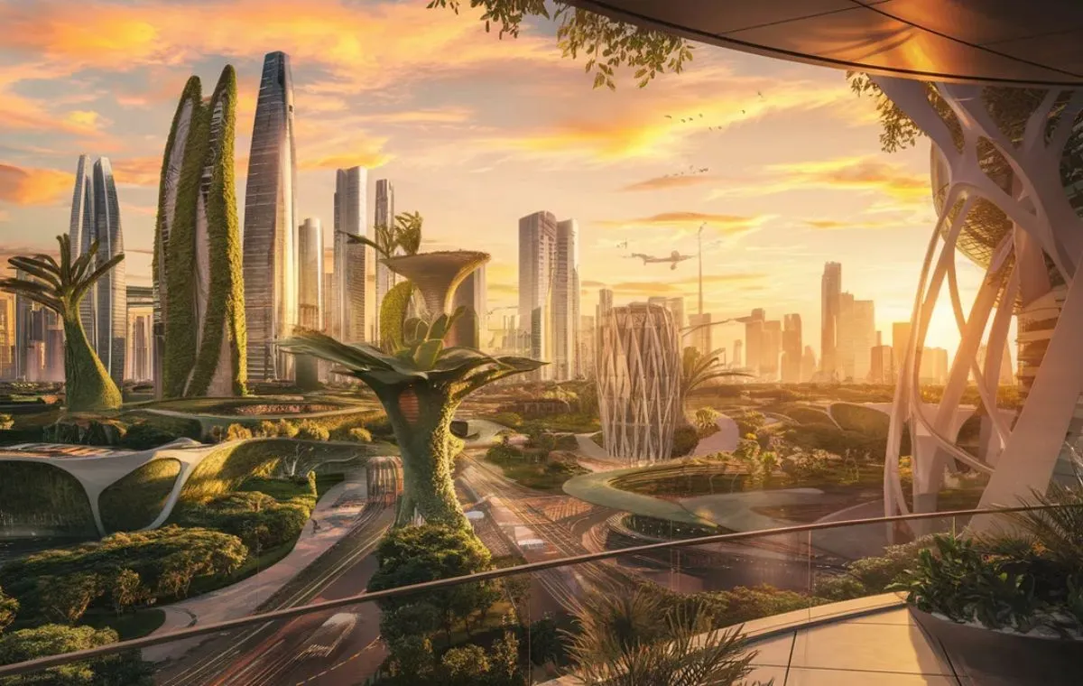 «یک منظره شهری آیندهنگر خیرهکننده در غروب خورشید، از بالکنی کمی مرتفع دیده میشود. صحنه در نور گرم ساعت طلایی غرق شده، با سایههای بلند که در شهر کشیده شدهاند. آسمان بهصورت طیف رنگی پرجنبوجوشی از نارنجی، زرد و صورتی است که به زیبایی با تنهای رنگی فلزی سرد در ساختمانها و سبزی باغها و گیاهان عمودی در تضاد است. آسمانخراشهای بلند با طراحیهای براق و آیندهنگر به سمت آسمان کشیده شدهاند، سطوحشان با بازتابهای طلایی میدرخشد. در میان آنها، ساختارهای بیومورفیک شبیه گیاهان زنده عظیم در هم تنیدهاند، فرمهای ارگانیکشان بهطور یکپارچه با محیط تکنولوژیک ترکیب شده است. خیابانهای پایین تصویر و هوای بالا پر از جزیئات ظریفاند. وسایل نقلیه و پهپادهایی با ظرافت در صحنه حرکت میکنند. جو، عظمت آرامشبخشی را القا میکند، با تعادل کامل بین طبیعت و فناوری. سبک فوتورئالیستی با چاشنی فانتزی وجود دارد که جزئیات پیچیده ساختمانها، باغها و چراغهای شهر را در حال روشنشدن در غروب خورشید را به تصویر میکشد.»