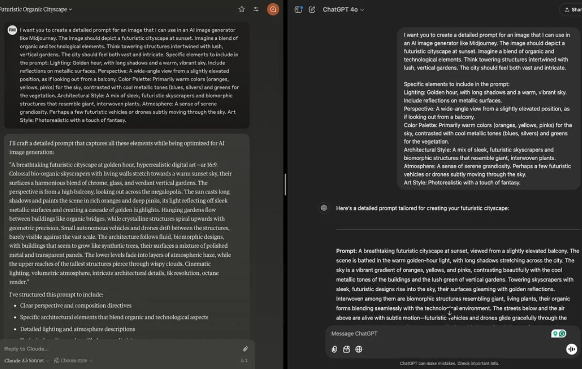 «میخواهم یک دستور دقیق برای یک تصویر ایجاد کنی که بتوانم از آن در یک تولیدکننده تصویر هوش مصنوعی مثل Midjourney استفاده کنم. تصویر باید یک منظره شهری در آینده (آیندهنگر) باشد که غروب خورشید را نشان دهد. تصور کن ترکیبی از عناصر ارگانیک و تکنولوژیک با هم در تصویر وجود داشته باشند. ساختمانهای بلند با باغهای عمودی سرسبز در هم تنیده هم باشند. شهر باید هم وسیع و هم پیچیده به نظر برسد.