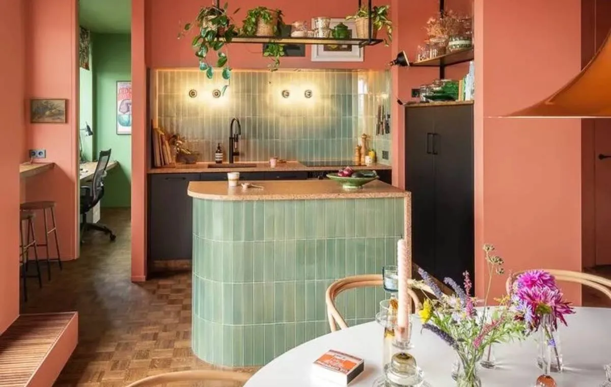 برای ایجاد یک طرح رنگی بازیگوشانه، دیوارهای مرجانی با کاشی کاریهای سبز دریایی را در یک آشپزخانه با یکدیگر ترکیب کنید. بالای پیشخوان آشپزخانه هم قفسهای برای نگهداری گیاهان سبز آویزان کنید. بسیاری از گیاهان رنگ سبز نعنایی را به نمایش میگذارند، در حالی که پیشخوانها و دیوارهای بلوطی رنگ آن را با حال و هوایی طبیعی و خاکی فضای این آشپزخانه را متعادل خواهند کرد.