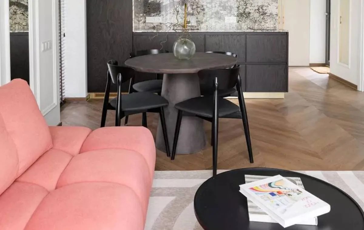 یک مبل به رنگ مرجانی تیره با کابینتهای زغالی در یک فضای نشیمن- ناهارخوری با پلان باز، حسی پیچیده ایجاد میکند. یک میز عسلی مشکی رنگ باعث میشود پالت رنگی این فضا یکپارچه به نظر برسد و تهرنگهای طلایی در لوستر و سختافزار این فضا، درخشندگی را برای تکمیل رنگ مرجانی به ارمغان میآورد.