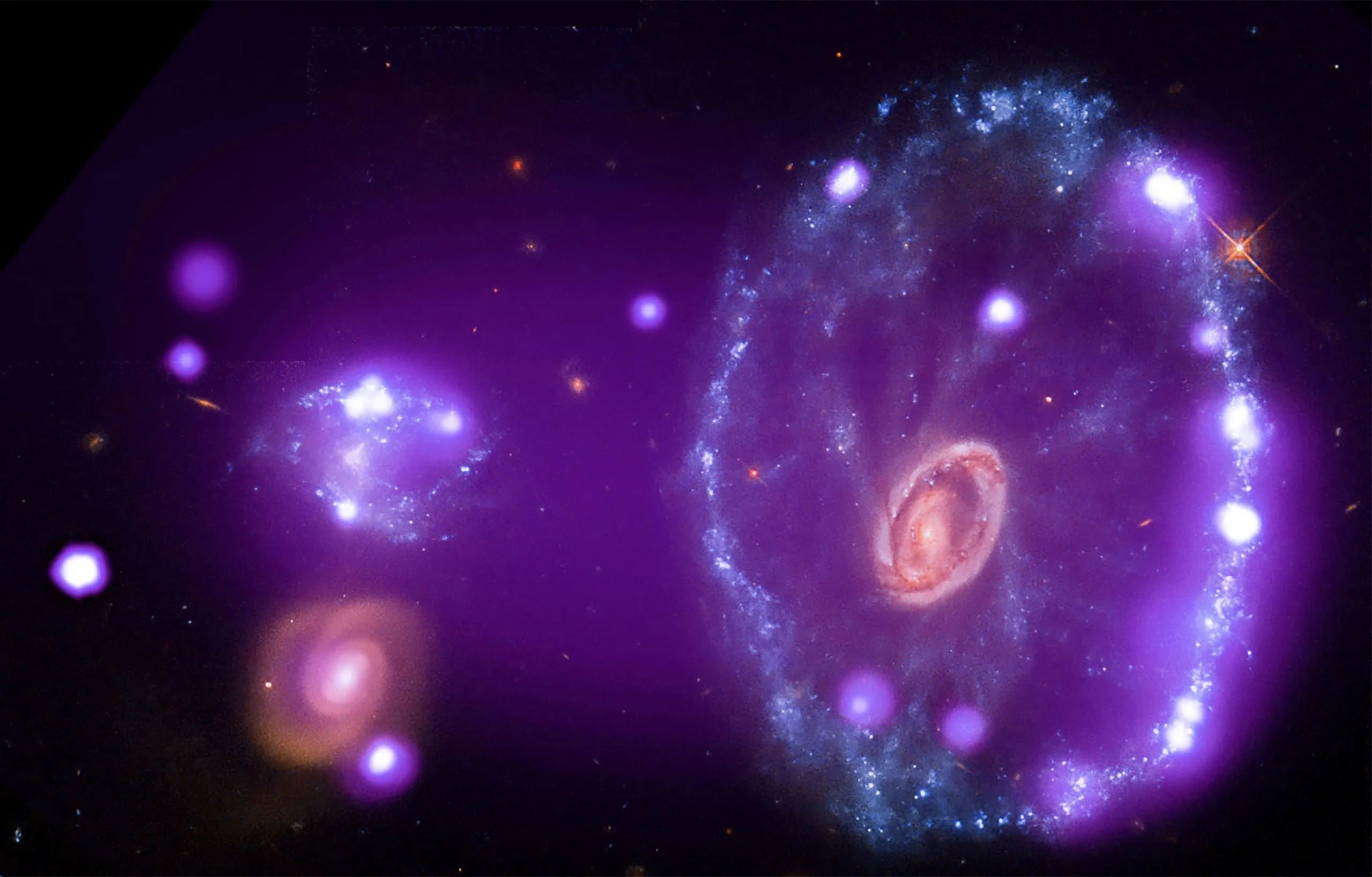 در یکی از این تصاویر منتشر شده، دادههای پرتو ایکس از چاندرا به رنگ بنفش، نشان میدهد که گاز داغ آشفتهای که در ابتدا در کهکشان چرخ گاری بوده است، در اثر برخورد کهکشانی بیش از 150 هزار سال نوری کشیده شده است. دادههای نوری از هابل به رنگ قرمز، سبز و آبی نشان میدهد که این برخورد در کدام مناطق باعث شکلگیری ستارهها شده است.