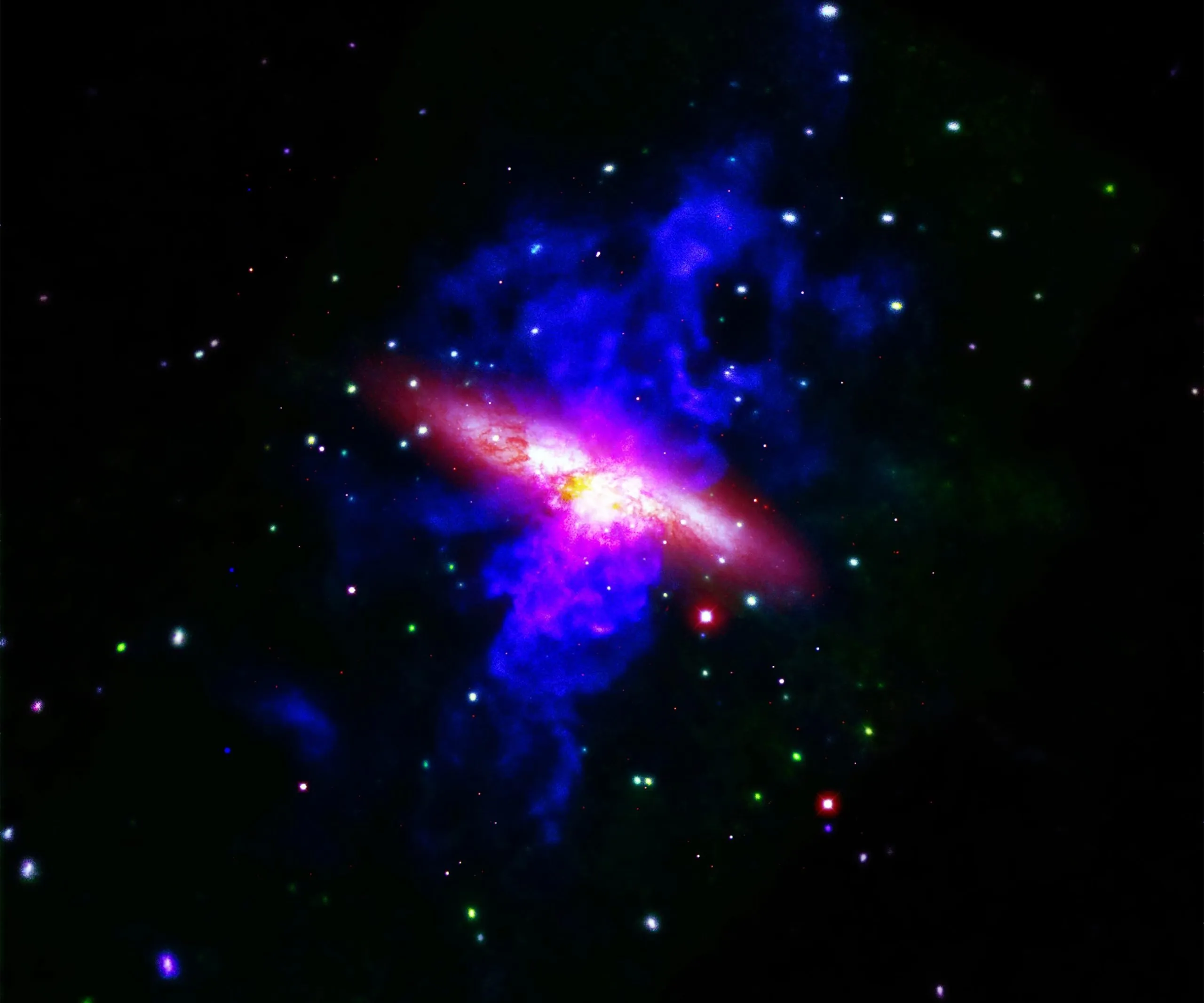 مسیه 82 یا M82 کهکشانی است که صفحهی آن کمی نسبت به دید ناظر زمینی مایل است. این امر به ستارهشناسان و تلسکوپهای آنان امکان میدهد مناظر جالبی از چیزی که درون کهکشان و هنگام انفجارهای پیشستارهای رخ میدهد، ببینند. پرتوهای ایکس در این تصویر (به رنگ آبی و صورتی) توسط تلسکوپ چاندرا رصد شده و خروج گاز تا حدود 20 هزار سال نوری را نشان میدهد که دمای آن با انفجارهای تکرارشوندهی ابرنواختری تا 10 میلیون درجه بالا میرود. دادههای نوری (طیف مرئی) از تلسکوپ فضایی هابل گرفته شده و با رنگهای قرمز و نارنجی کهکشان را نشان میدهد.