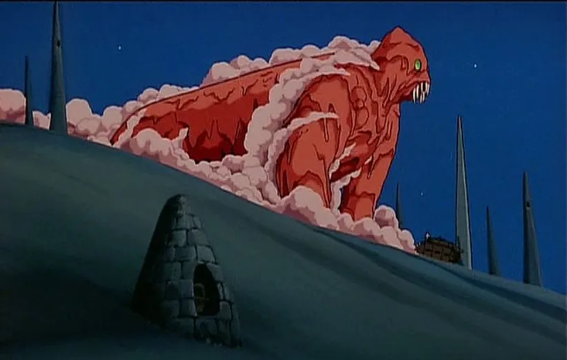 بعد از چشمانداز ماشین کشتار هستهای عظیم، دیدن سلاح کشتار جمعی بیولوژیکی ترسناکترین چیزی است که میتوان تصور کرد. طراحی خدای جنگجو انیمهی «نائوشکا از دره باد» تقریباً شبیه موجودی است که از فیلمهای دیوید کراننبرگ بیرون آمده است. خدای جنگجوی بازمانده درحالی پیدا میشود که گذر زمان آن را شکسته و ویران کرده و بخشهای ناهموار و پوسیدهای از آن به جا گذاشته است.