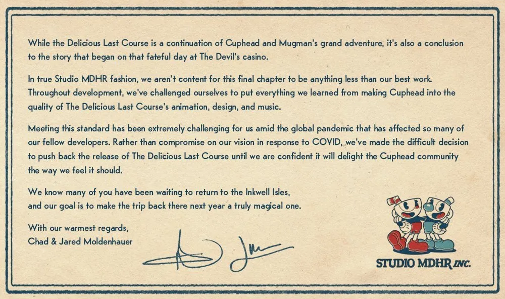 متأسفانه با وجود برنامهی اصلی استودیوی MDHR، سازندگان بازی کاپهد مبنی بر عرضهی این محتوای دانلودی در سال ۲۰۱۹، زمان انتشار آن تا سال جاری میلادی تأخیر خورد. اما این تأخیر آخرین تأخیر محتوای دانلودی این بازی نبود و سازندههای بازی کاپهد به سبک و سیاق خودشان، نامهی شبیه به نامههای دههی ۳۰ میلادی منتشر کردهاند. سازندگان بازی بیان کردهاند توسعهی این محتوای دانلودی در شرایط فعلی ساده چندان نیست.