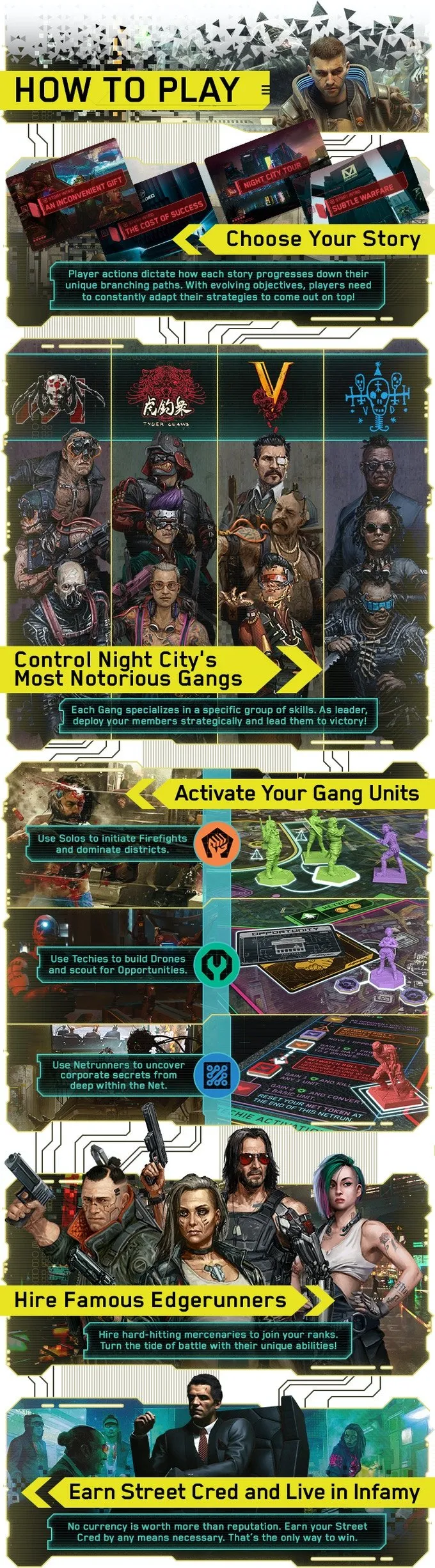 این بازی که به لطف کمپین کیکاستارتر (Kickstarter) توسعه یافته، یک تغییر جذاب در بازی نقشآفرینی اخیر استودیوی سیدی پراجکت رد است که توسط همین استودیو و مایک پونداسمیث (Mike Pondsmith)، طراح آمریکایی مشهور بازیهای رومیزی، طراحی و تولید شده است. Gangs of Night City توسط استودیوی CMON Games منتشر خواهد شد که در گذشته بازیهایی رومیزی را بر اساس گاد آو وار و بلادبورن عرضه کرده است.