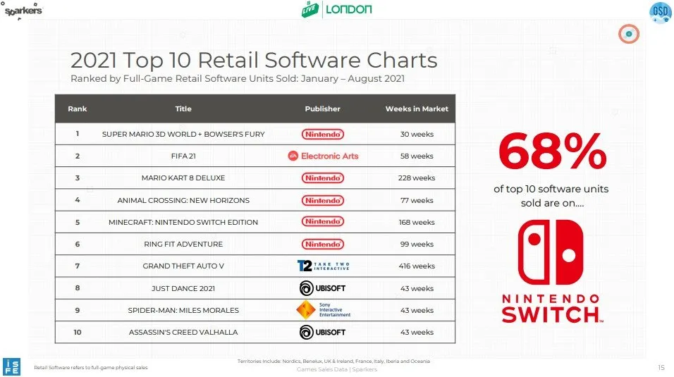 وقتی به ده بازی پرفروش فیزیکی سال 2021 تا به این لحظه (دوباره میگویم از ژانویه تا اوت) نگاه میکنید، پنج نمونه از شش بازی پرفروش از آثار نینتندو هستند. 68 درصد از کل نسخههای فروخته شدهی 10 بازی پرفروش روی نینتندو سوییچ فروخته شده است.