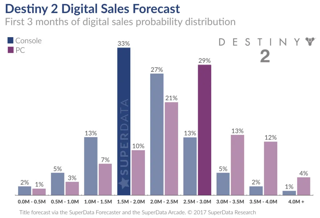 «دستینی 2» (Destiny 2) ممکن است در سه ماههی اول عرضهی خود، فقط روی پلتفرم رایانههای شخصی بیش از سه میلیون نسخه بفروشد. این آمار و ارقام را موسسهی SuperData ارایه داده است. طبق گفتهی این شرکت، احتمالا دستینی 2 میتواند به موفقترین بازی کامپیوتر از زمان عرضهی اورواچ (Overwatch) تبدیل شود.