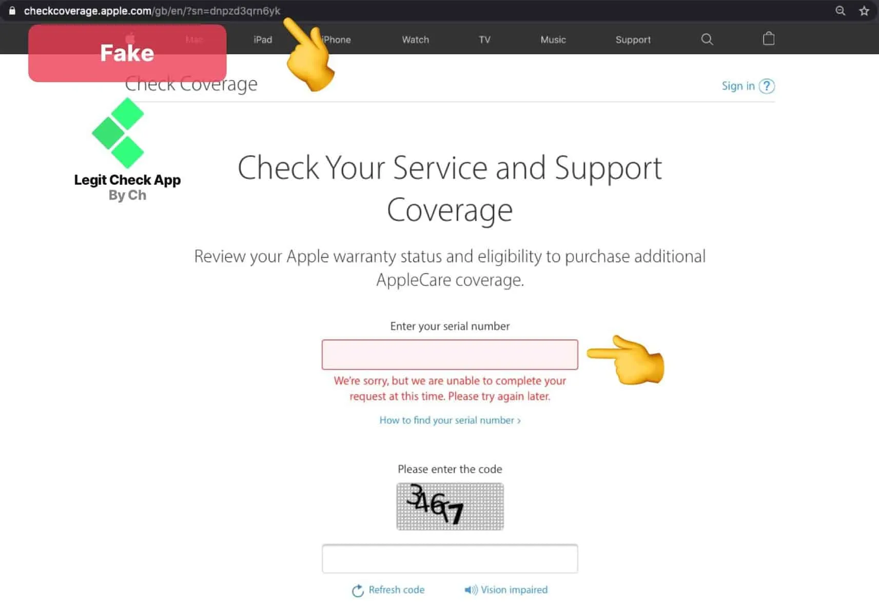در محصولات تقلبی، شماره سریال ممکن است جعلی، نادرست یا حتی تکراری باشد. برخی از تولیدکنندگان محصولات تقلبی از شماره سریالهای تکراری یا تصادفی استفاده میکنند که در وبسایت اپل معتبر نیستند. اگر شماره سریال وارد شده در وبسایت اپل معتبر نباشد یا هیچ اطلاعاتی از آن نمایش داده شود، احتمالاً محصول تقلبی است. همچنین، در برخی موارد ممکن است شماره سریال روی جعبه با شماره سریال دستگاه همخوانی نداشته باشد که این نیز نشانهای از تقلبی بودن محصول است.