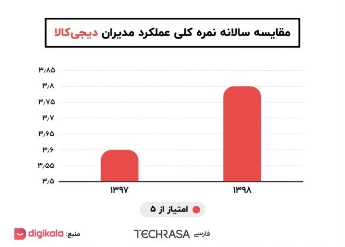 طبق نمودار فوق، عملکرد مدیران دیجیکالا از سال ۹۷ تا ۹۸، ۷/۵٪ بهبود داشته است.