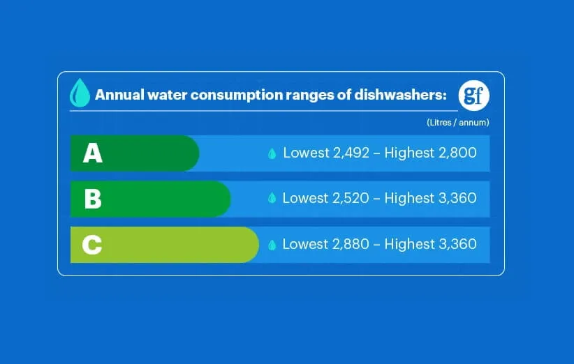 جدول زیر مصرفِ سالیانه آب برای ماشینهای ظرفشویی را بر اساس برچسب انرژی آنها نمایش میدهد: