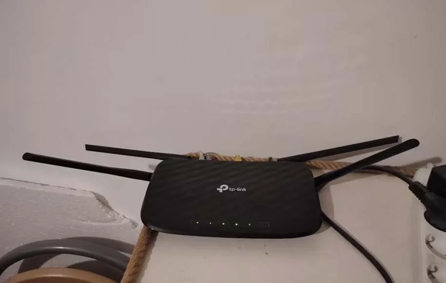 نکته مهم این است که نوک آنتن به سمت جایی که سیگنال در آنجا پخش میشود، اشاره نمیکند. سیگنال از کنارههای آنتن ساطع میشود، بنابراین جهت مناسب در واقع کاملاً برعکس این است. همانطور که در تصویر زیر میبینید، آنتنهای روتر به گونهای زاویه داده شدهاند که پوشش عمودی بیشتری ایجاد کنند. در اتاقی که این روتر قرار دارد، سیگنال کاملاً قوی است و به لطف آنتنهای زاویهدار، در طبقه پایین نیز سیگنال بسیار خوبی دریافت میشود.
