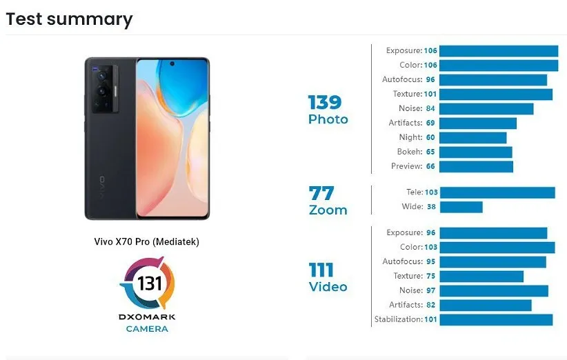 بنچمارک DxOMark بهتازگی نتایج بررسی کامل دوربین گوشی هوشمند ویوو X70 پرو در سال گذشته منتشر را کرده که ما متوجه شدیم که یکی از بهترین دوربینهای موجود در بازار است. بنچمارک DxOMark، وبسایتی مستقل است که بهصورت علمی دوربینهای عکاسی، لنزها و دوربین تلفنهای هوشمند را بررسی میکند. معمولا به امتیازهای ارائه شده توسط DxOMark بهعنوان یکی از معتبرترین معیارها برای مقایسهی کیفیت دوربین گوشیهای هوشمند، استناد میشود. طبق نتایج منتشر شدهی بنچمارک DxOMark، این گوشی هوشمند امتیاز کلی 131 را به دست آورد و در جایگاه دوازدهم با اوپو Find X3 پرو و ویوو پلاس X50 پرو در یک رتبه قرار دارد. اما نکته جالب توجه در این نتایج این است که دوربین گوشی ویوو X70 پرو یک رتبه بالاتر از آیفون 12 پرو مکس، آیفون 13 و 13 مینی قرار گرفته است.