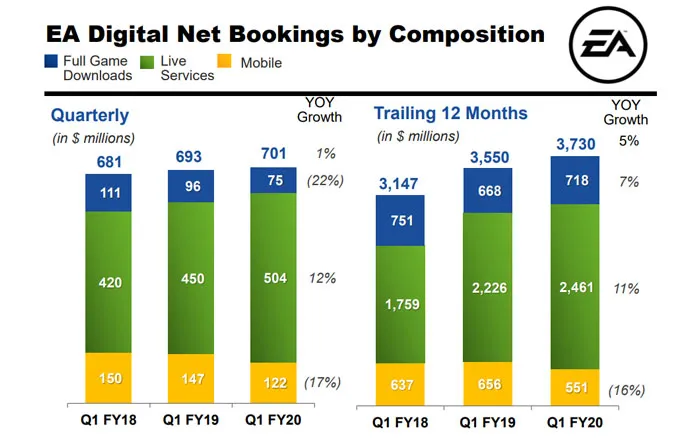 EA از جمله شرکتهایی است که بازیهای آنلاین و سرویسهای اشتراکی زیادی دارد. بازیهایی مثل Battlefield V، Apex Legends، The Sims 4، Anthem و همچنین حالت Ultimate Team بازیهای ورزشی این شرکت مثل FIFA 19، NHL 19 و… روی درآمد کلی شرکت بیشترین تاثیر را داشتهاند. سرویسهای اشتراکی هم شامل EA Access و Origin Access میشوند. بازی آنلاین Star Wars: The Old Republic اشتراکهای اختیاری را به بازیکنان پیشنهاد میدهد.