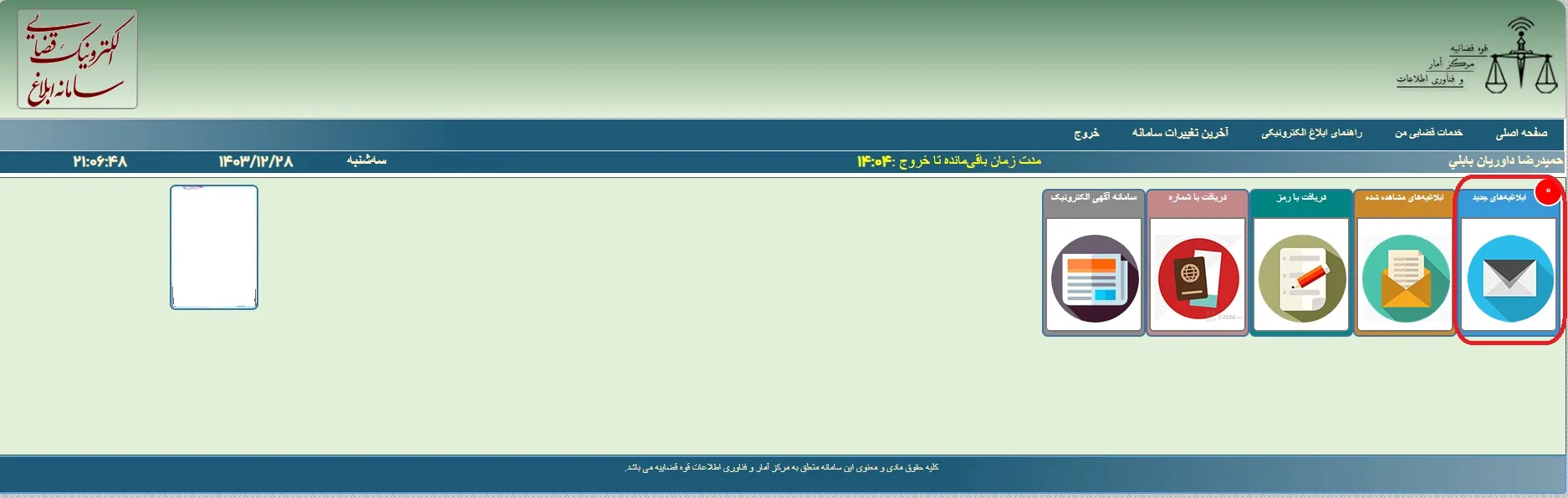 به همین سادگی وارد صفحه ابلاغیه الکترونیکی خواهید شد و میتوانید ابلاغیههای جدید خود را مشاهده کنید. در صورتی که ابلاغیه جدیدی دارید، کافی است روی گزینه «ابلاغیههای جدید» کلیک و آن را مشاهده کنید.