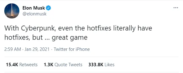 ساعاتی پیش ایلان ماسک در توئیتی از بازی سایبرپانک ۲۰۷۷ بهعنوان یک بازی «بازی خوب» یاد کرد. همین توئیت کافی بود تا شرکت «سی دی پراجکت» با رشد ۲۰ درصدی در سهام خود روبهرو شود. در حالی که شرکت سیدی پراجکت امسال را با مشکلات فنی بازی سایبرپانک ۲۰۷۷ شروع کرد و ارزش سهام شرکت با افت بسیاری روبهرو شد، توییت مدیر عامل شرکت تسلا، ایلان ماسک، ورق را برگرداند. سهام شرکت بازیسازی مستقر در لهستان بلافاصله بعد از این توئیت افزایش داشت و به نظر میرسد نظر بسیاری هم نسبت به بازی تغییر کند.