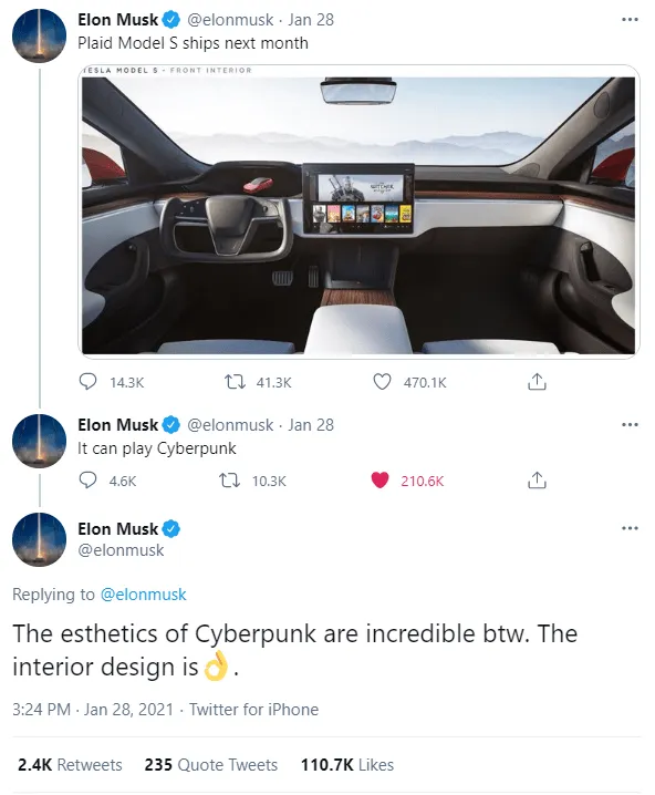 ایلان ماسک، میلیاردر دنیای تکنولوژی طی روزهای گذشته هم در حساب رسمی توییتر خود به نمایش مدل جدید اتومبیل برقی تسلا یعنی Model S Plaid پرداخته بود. او مدعی است که این اتومبیل در کمتر از دو ثانیه به سرعتی معادل ۶۰ مایل در ساعت میرسد. اتومبیل تسلا «مدل س پلید» در ماه فوریه با قیمت ۱۱۳ هزار دلار عرضه میشود. ماسک در این توئیت خود با پخش تصاویری از طراحی داخلی خودرو و مانیتور مزین به یک پوستر از بازی ویچر ۳ مدعی است که با این خودرو میتوان سایبرپانک ۲۰۷۷ را بازی کرد.