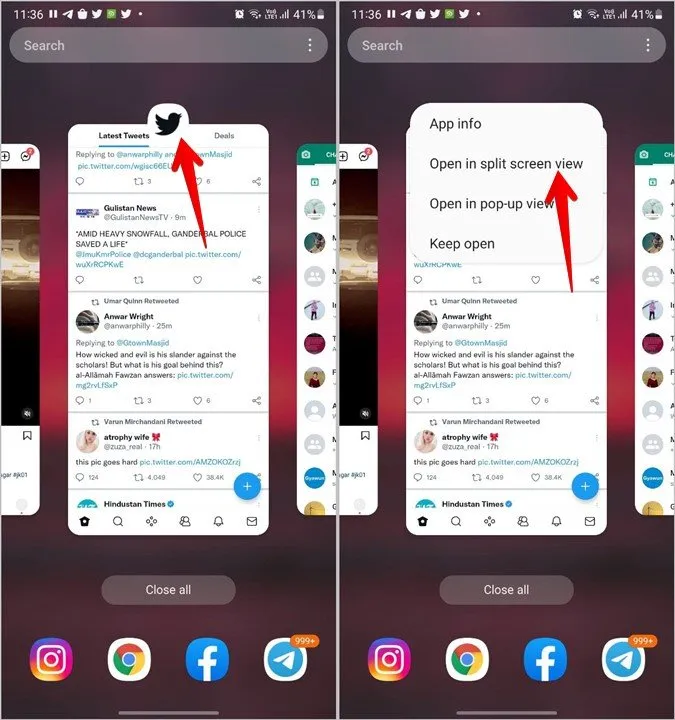 - روی آیکون برنامه ضربه زده و از بین گزینههای آن، Open in split screen view را انتخاب کنید.