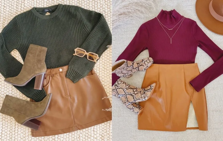 این مدل استایل جزو شیکترین پوششها به شمار میرود چراکه ناخودآگاه حالتی لاکچری و گرانقیمت به ظاهر شما میدهد. اگر به رنگهای پاییزی مانند، شتری، آجری، زرشکی، سبزتیره یا قهوهای سوخته در حالتی کلاسیک علاقهمند هستید میتوانید آیتمهای مطرح شده را با چنین رنگهایی استایل کنید. خالی از لطف نیست اگر بدانید که استفاده از بوتی ساده یا حتی طرحدار (اما هماهنگ با سایر لباسها) که با رنگ بافت یا دامن چرمی شما هماهنگ است هم میتواند زیبایی استایل شما را چند برابر کند. در ادامه چند نمونه استایل جذاب با دامن چرمی برای فصل زیبای پاییز را نمایش میدهیم: