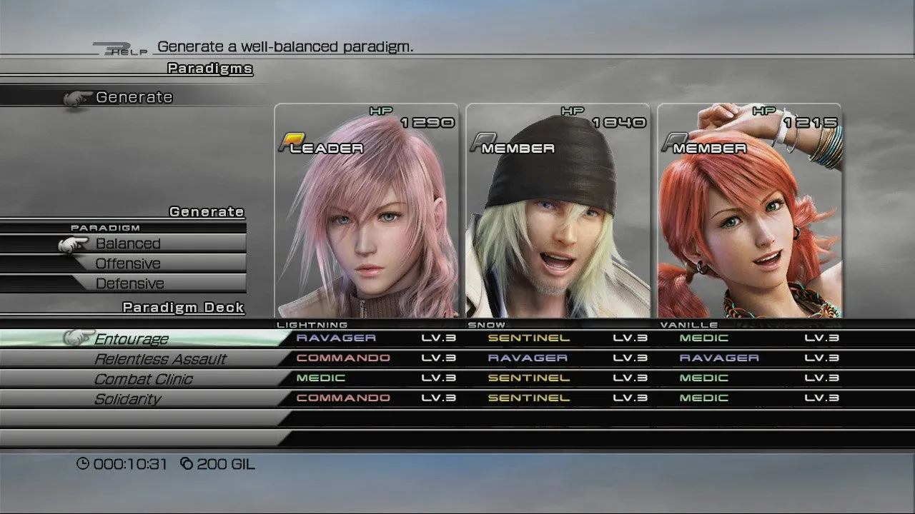 قصه و کیفیت ارایهی بازی به کنار، فاینال فانتزی 13 همچنین برای گیمپلی خود ذرهای کم نمیگذارد. به راحتی میتوانیم بگوییم که فاینال فانتزی 13 بهترین سیستم مبارزه را بین تمام شمارههای سری فاینال فانتزی دارد. مبارزات بازی مبتنی بر سیستمی به نام «تغییر پارادایم» (Paradigm Shift) کار میکنند. برای هر کدام از شخصیتها، تعدادی کلاس در اختیار دارید؛ کلاسهای همیشگی مثل «جادوگر» که کارش هدف گردن نقطه ضعف دشمن است، کلاس «مبارزه» که کارش صدمه وارد کردن است، کلاس «تانک» که دشمن را به سمت خود میکشد و صدمات را جذب میکند، کلاس «پشتیبان» که خط سلامتی افراد تیم را پر میکند و قدرتهای مختلف به افراد میدهد و به همین منوال…
