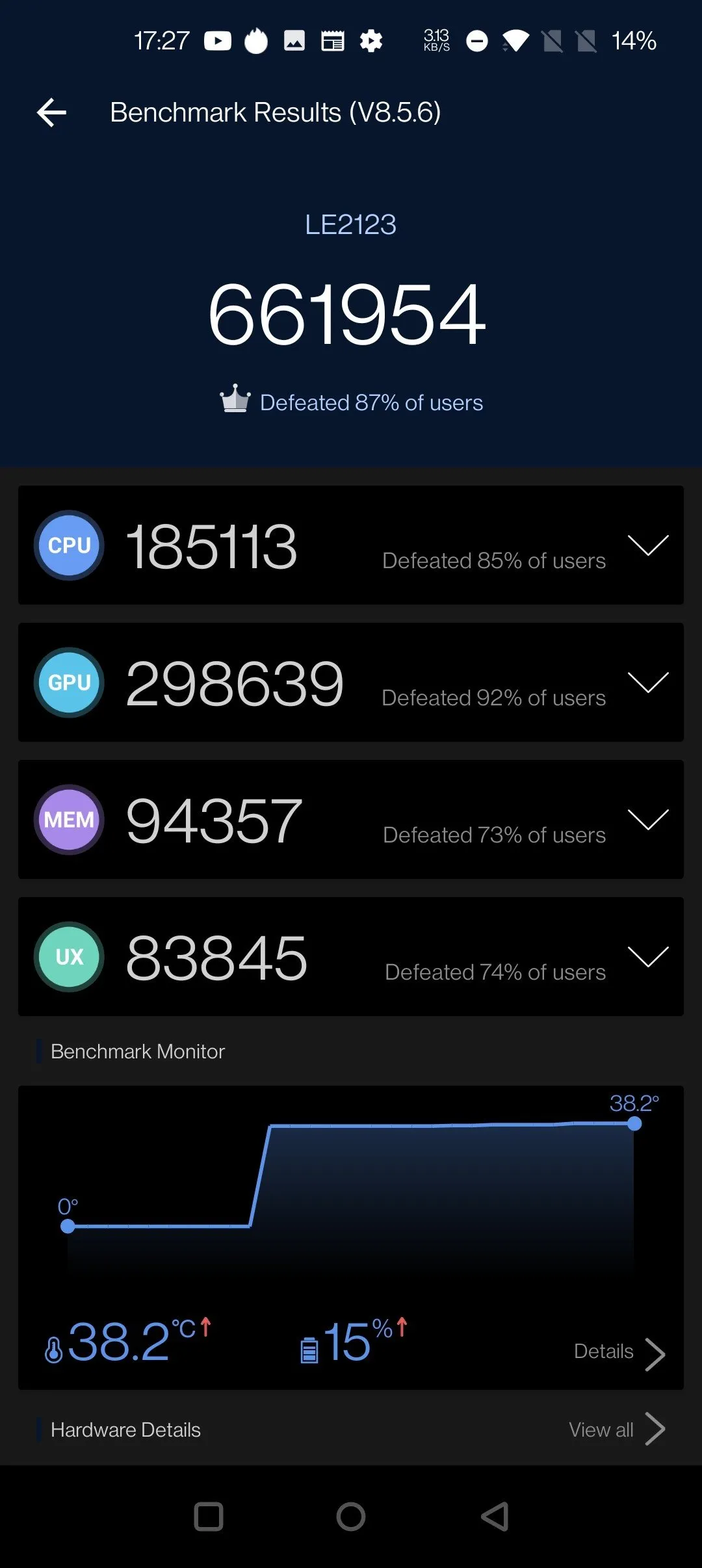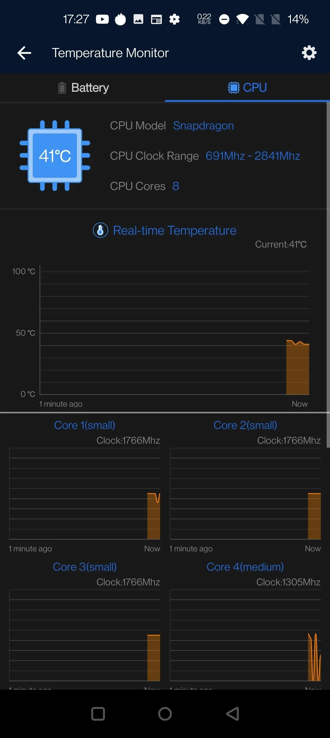 صرف نظر از امتیاز کسب شده، میبینیم که دمای پردازنده در فشار سنگین بنچمارک به 41 درجه رسید که بسیار خوب است. احتمالا وانپلاس 9 پرو باید مدیون سیستمخنککنندگی گیمینگ خود باشد که در خنک نگه داشتن گوشی توانسته عملکرد بینقصی از خود به نمایش بگذارد.