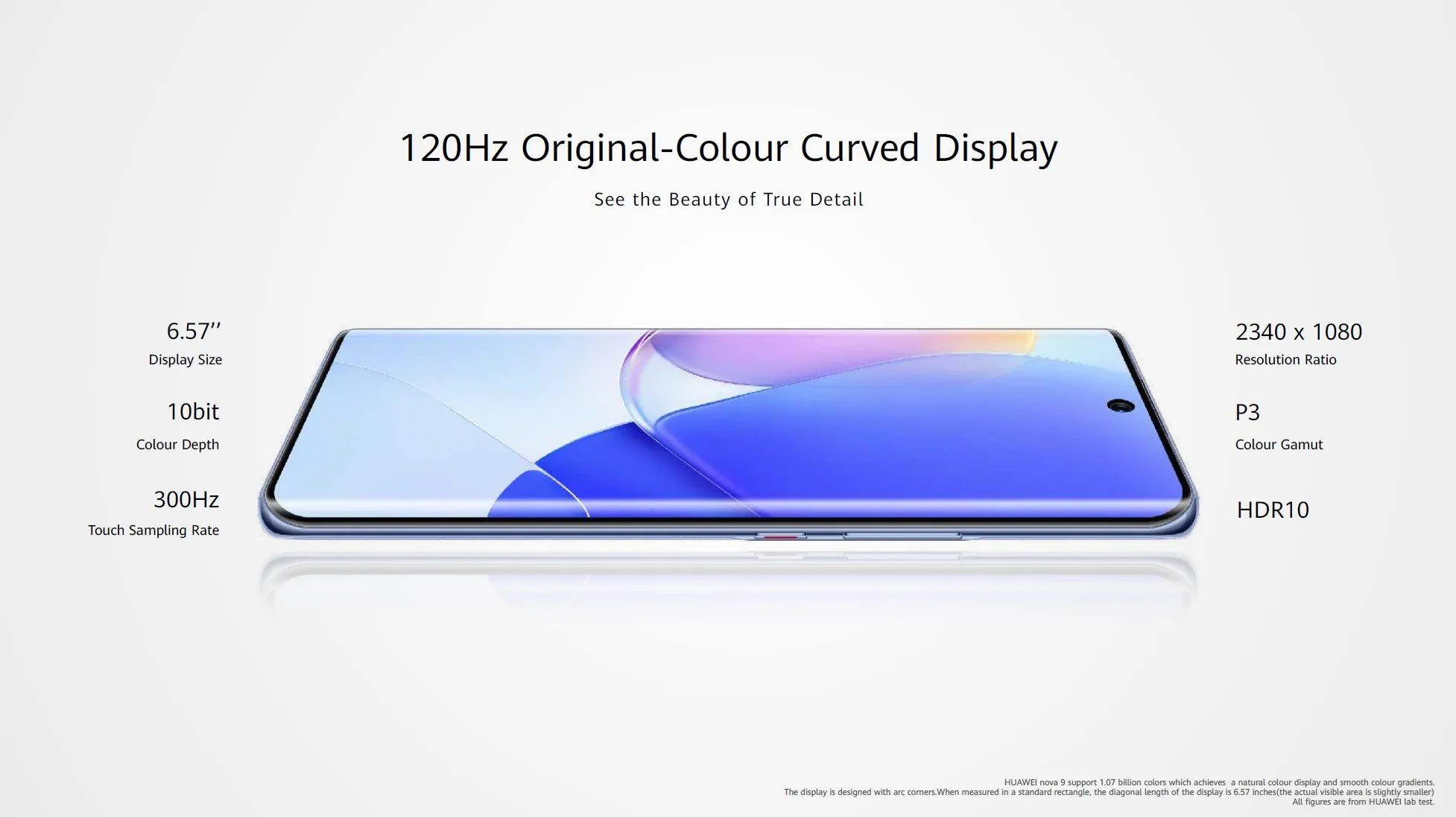 در حال حاضر اکثر گوشیهای پرچمدار به صفحهنمایشهایی با نرخ بهروزرسانی 120 هرتزی مجهز شدهاند و این قابلیت کم کم پا به گوشیهای میانرده هم گذاشته است. هواوی nova 9 هم از جمله محصولات میانردهای است که این قابلیت را دارد. هرچه میزان نرخ بهروزرسانی تصاویر بالاتر باشد حرکات روی صفحهنمایش گوشی روانتر و بدون پرش تصویر انجام میگیرند. این ویژگی نه تنها در هنگام تماشای ویدیوهای با کیفیت بالا و بازیها، بلکه حتی هنگام حرکت بین منوها یا مطالعه متون هم بسیار کارآمد و فوقالعاده است. این قابلیت مخصوصا زمانی بیشتر خودنمایی میکند که همزمان دو گوشی موبایل با نرخ بهروزرسانی صفحهنمایش 60 یا 90 هرتزی را در کنار یک نمونه 120 هرتزی امتحان کنید. علاوه بر این، صفحهنمایش 6.57 اینچی OLED هواوی nova 9 از لبههای خمیدهای بهره میبرد که علاوه بر خوشدستتر شدن گوشی، کمک کرده است تا نسبت صفحهنمایش به بدنه به عدد 90 درصد برسد.