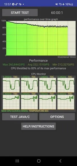 از لحاظ پایداری سختافزاری، اگزینوس 1380 عملکرد فوقالعادهای چه در بخش گرافیکی و چه پردازشی دارد. این گوشی پس از 1 ساعت تحمل فشار سنگین، 83٪ از توان پردازنده و بعد از 20 دقیقه فشار روی گرافیک، تقریبا 100٪ توانش را حفظ کرد. در آن طرف، اسنپدراگون 7 پلاس نسل 2 اگرچه در 20 دقیقهی آخر، پایداریاش از 80 به 64٪ کاهش پیدا کرد اما آنقدر قدرتمند هست که با همین میزان توانایی هم بهتر از اگزینوس 1380 باشد. هیچ یک از دو گوشی هم داغ نشدند، اما گرم چرا.