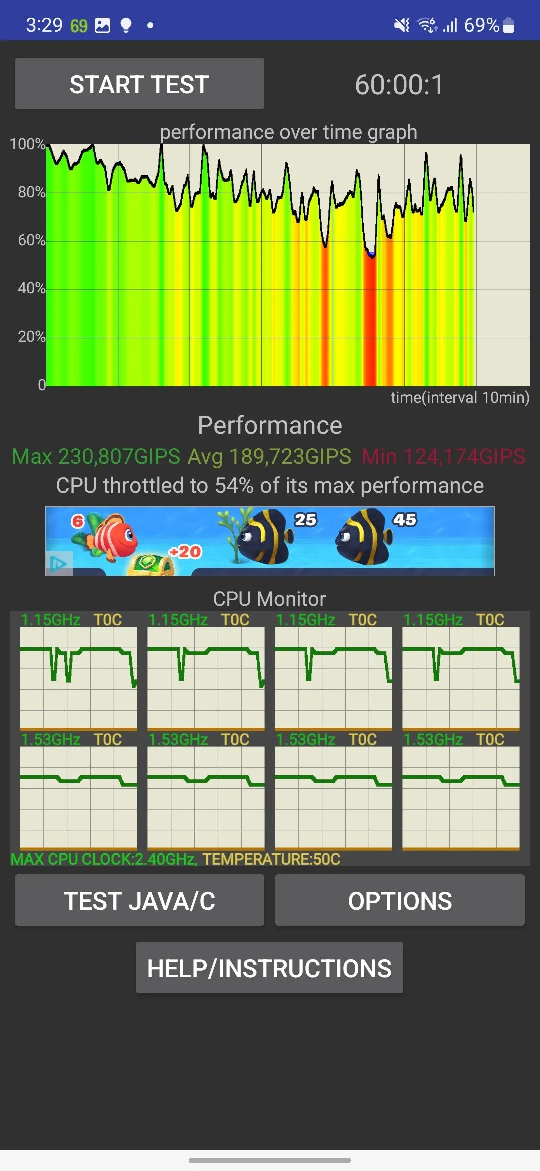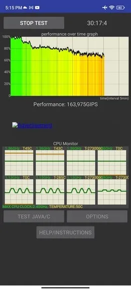 از لحاظ پایداری عملکرد هم میتوانید عملکرد دو گوشی را با هم با توجه به تصویر زیر مقایسه کنیم. اگرچه اسنپدراگون 7 نسل 1 حدودا 62٪ از توان خود را بعد از گذشت 1 ساعت حفظ کرد و گهگاهی هم نوساناتی را تجربه کرد ولی اگزینوس 1380 نوسان بسیار شدیدتری داشت. هرچند در بسیاری از مواقع، نمودار عددی بالاتر از 65 را نشان میداد به این معنا که این پردازنده و در نتیجه گلکسی A54 احتمالا اندکی بهینهتر هستند.