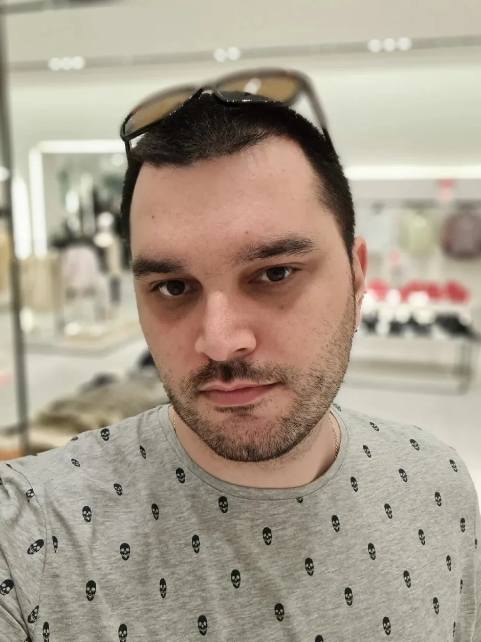 تصویر بعدی در فروشگاه و در شرایطی به ثبت رسیده که شرایط نوری به لطف لامپهای فراوان کاملا مساعد بود. دوربینهای سلفی در ثبت تصاویر پرتره به دلیل اینکه باید سوژهی دلخواه را از پسزمینه تشخیص داده و آن را بهخوبی سوا کنند بسیار کار سختی در پیش دارند. به همین خاطر در اکثر مواقع جلوههای مصنوعی زیادی را در تصاویر پرتره ثبت شده توسط دوربینهای سلفی، درست در قسمتی که سوژه باید از پسزمینه جدا شود شاهد هستیم.