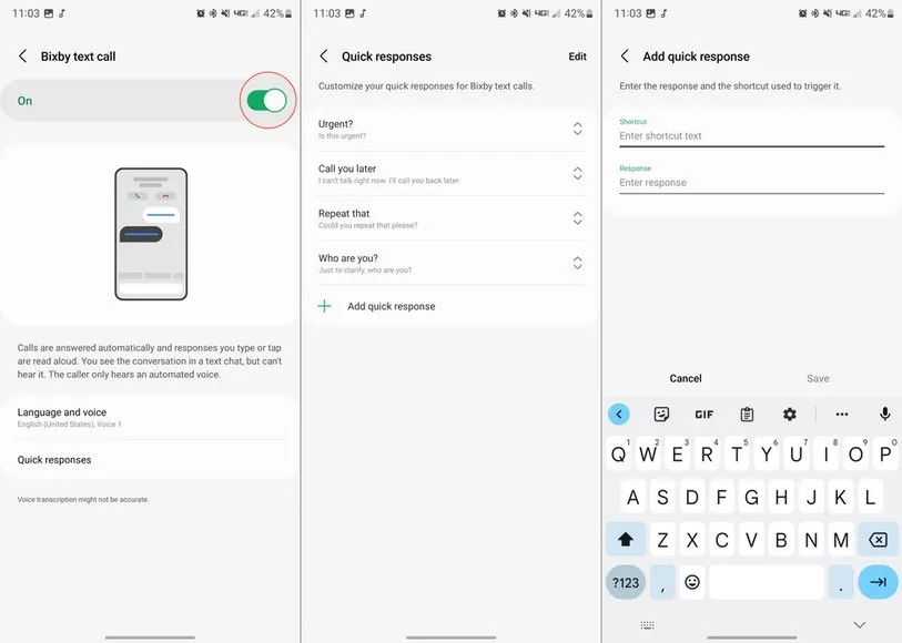 زمانی که پک زبانی دانلود و نصب شد، به تنظیمات Bixby text call بر میگردید. در این قسمت میتوانید پاسخهای سریع آمادهای ایجاد کنید که هنگام دریافت تماس میتوانید از بیکسبی بخواهید آنها را برای افراد مختلف ارسال کند.