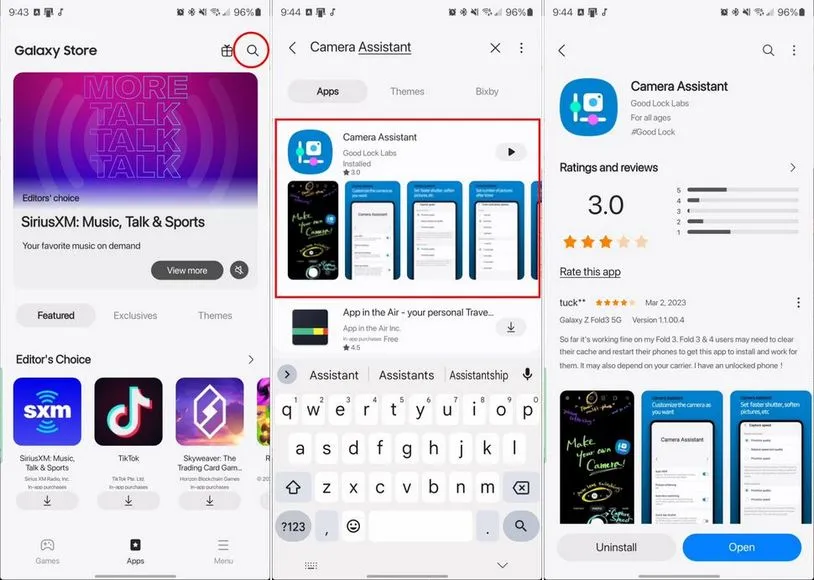 - به گلکسی استور رفته و نام Camera Assistant را در بخش جستوجو وارد کنید.
