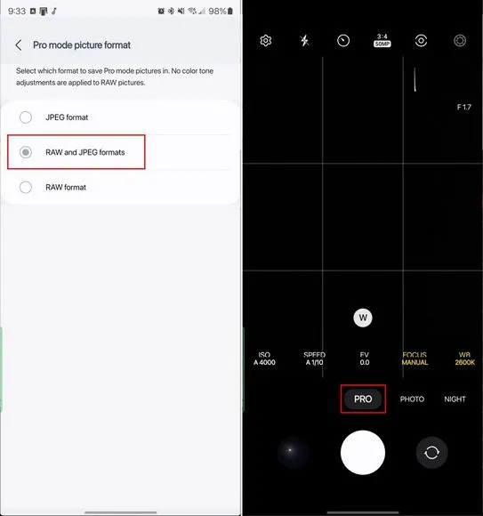 اگرچه فرمت Raw باعث میشود تصاویر ثبت شده حجم بسیار بالایی را از گوشی اشغال کنند، اما از طرفی خیالتان آسوده است که اعمال تغییرات مختلف روی این تصاویر به مراتب راحتتر از حالتی است که تصویر با فرمت JPEG ضبط میشود. در این حالت شما در اپهایی نظیر ادوبی لایتروم یا فتوشاپ میتوانید تغییرات دلخواه خود را به شکل بهتری روی تصاویر اعمال کنید. گلکسی S23 اولترا هم این امکان را به شما میدهد تا بتوانید تصاویر را با فرمت RAW ثبت کنید.