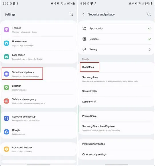 - در پایین بخش Security میتوانید عبارت Biometric را ببینید. روی آن کلیک کنید.