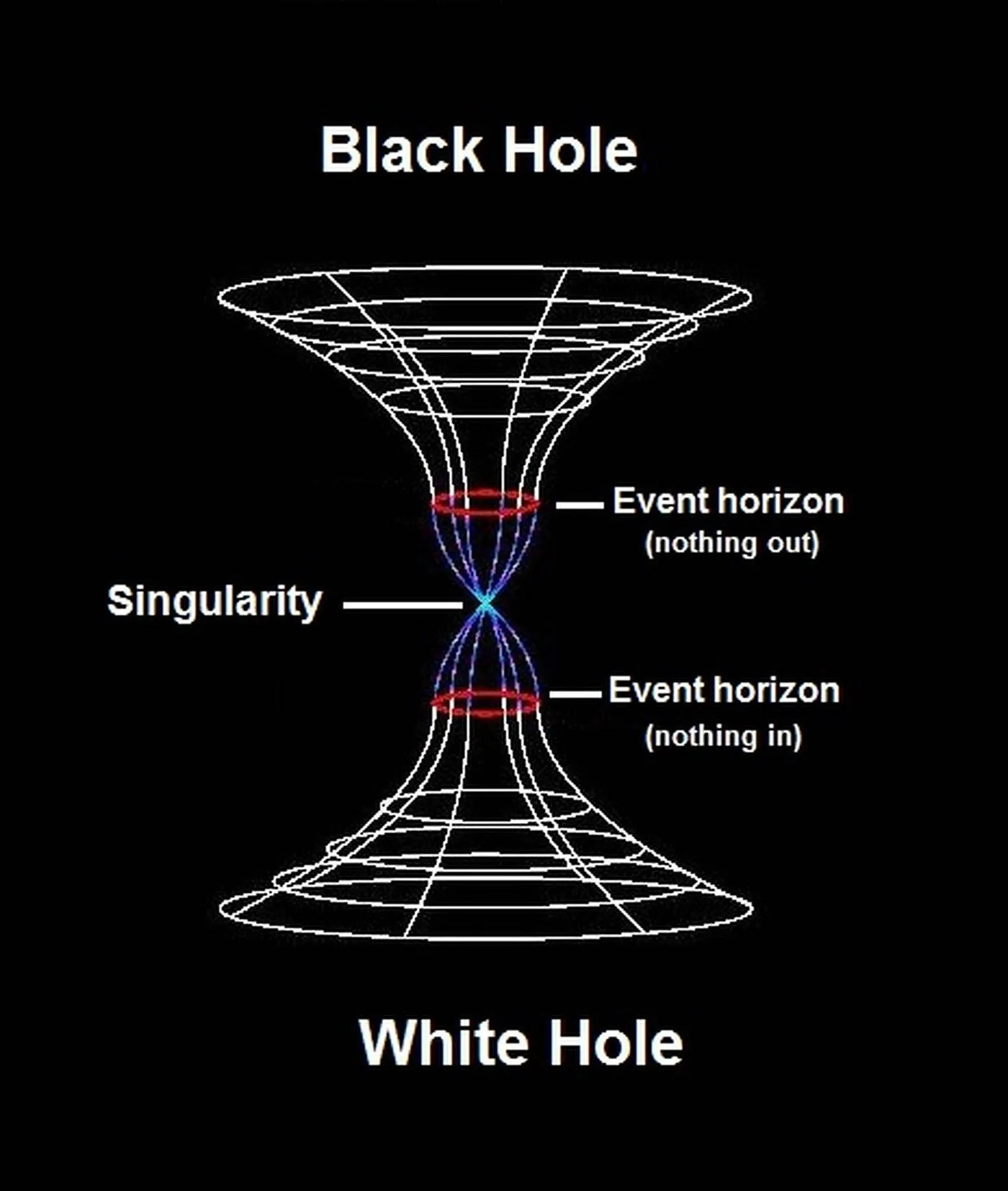 بنابراین در سیاهچاله، میتوانید به سمت درون و نه بیرون حرکت کنید، اما در یک سفیدچاله، میتوانید به سمت بیرون حرکت کنید اما راهی به سمت داخل ندارید.