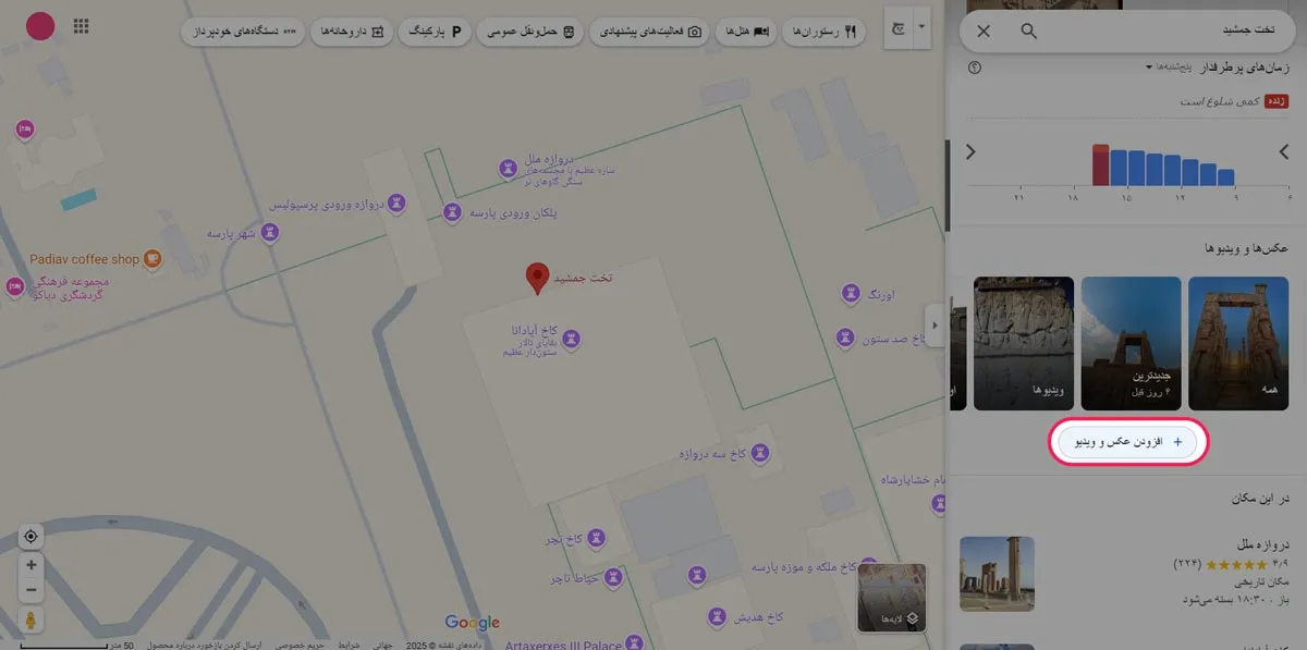 یکی از امکانات گوگل که بسیاری از نقشههای آنلاین از آن الگو گرفتهاند، امکان افزودن عکس و ویدیو به مکانهای مختلف است. افزودن عکس و ویدیو به گوگل مپ قوانین خودش را دارد؛ از جمله اینکه سوژهی عکس فضای داخلی و بیرونی مکان و ویژگیهای آن باشد، کپی از جایی نباشد و اثر شخصی کاربر باشد، چهره یا پلاک در آن نباشد و کیفیت مناسبی داشته باشد. برای قرار دادن عکس در حالت عمومی، کافی است مکان مورد نظر را در نقشه باز کنید و دکمهی «افزودن عکس و ویدیو» (Add photo and video) را بزنید.