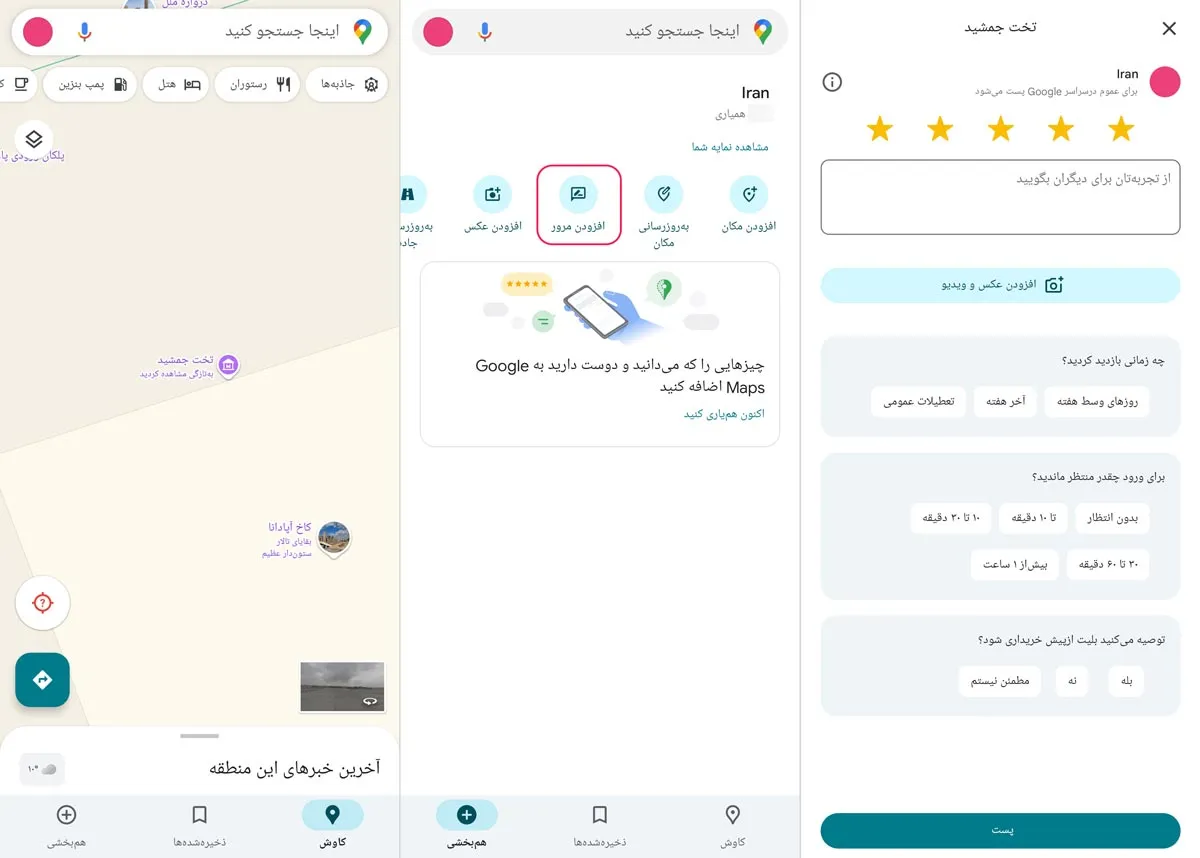 اما تحریم گوگل مپس پلتفرم، روی این بخش هم اثر گذاشته است و کاربران ایران گزینهی افزودن نظر را در اپلیکیشن نمیبینند. بنابراین برای افزودن نظر از اپلیکیشن، باید محدودهای را که مکان در آن قرار دارد در اپلیکیشن بیاورید و سپس از زبانهی «همبخشی» (Contribute) یا «شما» (You) در پایین صفحه، گزینهی «افزودن مرور» (Add review) را بزنید. اگر در لحظهی ثبت نظر، در همان مکان حضور داشته باشید، با زدن این گزینه مستقیما فهرستی از مکانهای اطراف را میبینید که باید مکان مورد نظر را از میان آنها انتخاب کنید. در غیر این صورت باید در کادر جستوجو با وارد کردن نام دقیق مکان، آن را یافته و وارد بخش افزودن نظر شوید و در ادامه امتیاز خود را ثبت و نظر خود را بنویسید و در پایان گزینهی پست را بزنید. بسته به نوع مکان بخش نظردهی میتواند شامل جزئیات بیشتری هم برای پر کردن باشد. رستورانها و کافهها از این جملهاند.