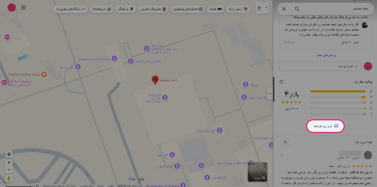 برای نوشتن نظر در گوگل مپ نسخهی وب، باید پس از باز کردن مشخصات مکان، از دکمهی «مروری بنویسید» (Write a review) استفاده کنید. در نسخهی اپ اما باید پس از باز کردن مکان، به زبانهی نظرات رفته تا ضمن دیدن نظرات کاربران، در بالای آنها ستارهها را برای رتبهدهی و نوشتن نظر ببینید و پس از نوشتن نظر گزینهی «پست» (Post) را بزنید.