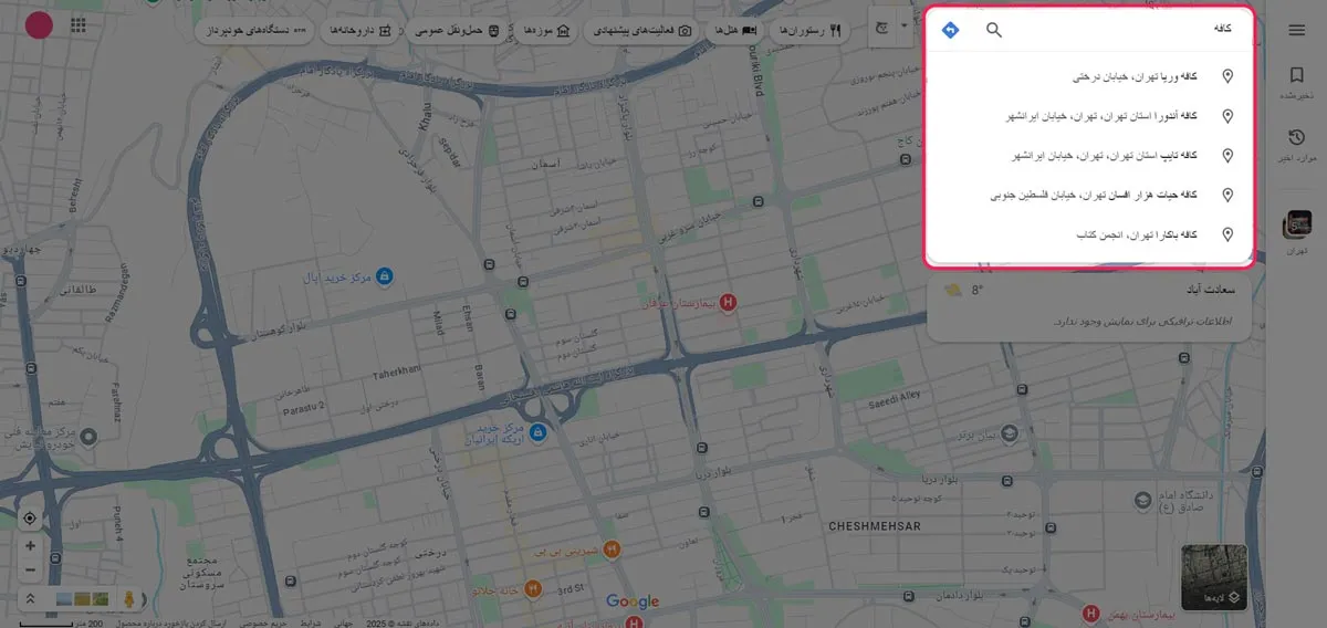 کادر جستوجو یکی از شاخصترین ویژگیهای گوگل و گوگل مپ است. چه در نسخهی وب و چه در نسخهی اپلیکیشنهای اندروید و iOS میتوانید بالای صفحه این کادر را ببینید و از آن برای جستوجوی هر مکان با نام مشخص خود فراهم کنید. توجه داشته باشید که چون گوگل مپ یک سامانهی مکانمحور است. نتایج جستوجو بر اساس منطقهای که در آن حضور دارید، متفاوت است و از مکانهای مختلف، نباید انتظار نتایج یکسان داشته باشید.