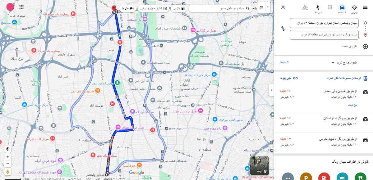 ویژگی مسیریابی گوگل مپ از پایهایترین امکانات آن است و به کاربران امکان میدهد تا مسیرهای بهینه را برای رسیدن به مقصد خود بیابند. برای شروع، کافی است برنامه را باز کرده و در نوار جستوجو، مقصد دلخواه را وارد کنید. سپس روی گزینهی «مسیریابی» (Directions) بزنید و مبدأ را مشخص کنید. گوگل مپ بهطور خودکار مسیرهای پیشنهادی را نمایش میدهد و بر اساس عواملی مانند فاصله، ترافیک لحظهای، وضعیت جادهها و حملونقل عمومی و همچنین میزان مصرف سوخت یا انرژی، بهترین مسیر را پیشنهاد میدهد.
