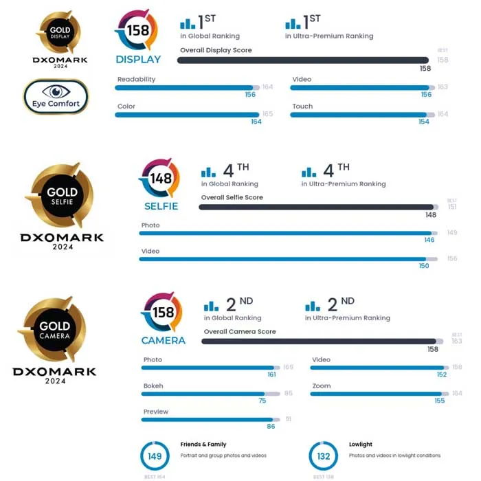 عملکرد دوربین سلفی پیکسل 9 پرو XL نیز قابلتوجه است. این گوشی با امتیاز 148 در رتبه چهارم قرار گرفته است. در حالت HDR، این گوشی با دیگر دستگاههای دارای امتیاز بالا از جمله Honor Magic 6 Pro و iPhone 15 Pro Max رقابت میکند. سایت DxOMark همچنین نتایج آزمون صفحهنمایش گوگل پیکسل 9 پرو XL را منتشر کرده است. این گوشی در این دستهبندی با امتیاز 158 در جایگاه اول قرار گرفته. به گفته DxOMark، ویژگی برجسته صفحهنمایش این گوشی “دقت رنگ فوقالعادهی” آن است.