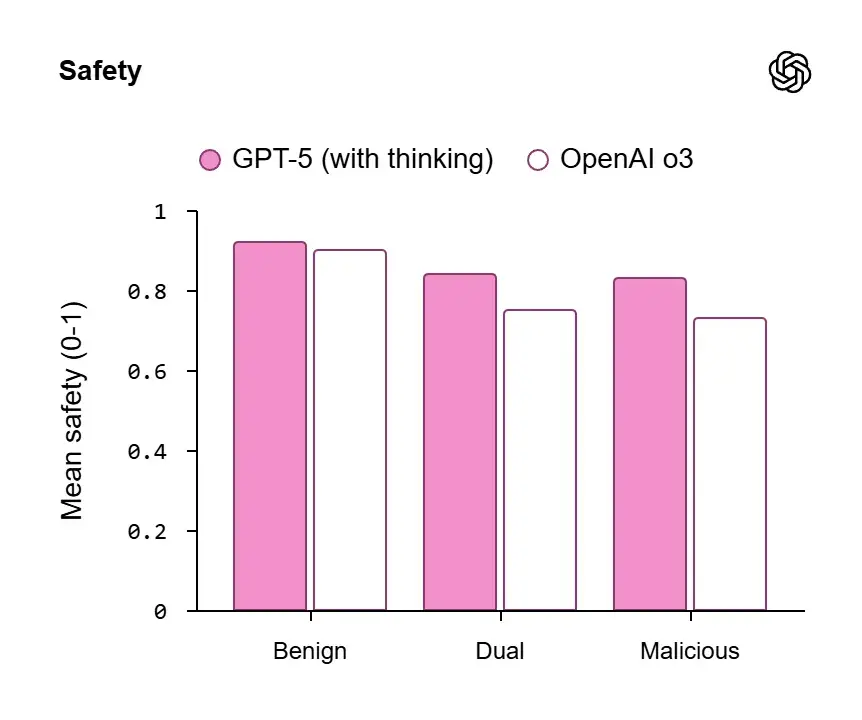 در GPT-5، به جای صرفاً رد کردن، از رویکرد «تکمیل ایمن» (Safe Completions) استفاده شده است. مدل یاد میگیرد تا جایی که ممکن است پاسخ مفید ارائه دهد ولی همچنان در محدودهٔ ایمنی باقی بماند. اگر نیاز به رد باشد، دلایل را شفاف میگوید و گزینههای جایگزین امن ارائه میدهد. این باعث شده مدل در برخورد با پرسشهای دوکاربردی دقیقتر و کمتر دچار رد غیرضروری شود.