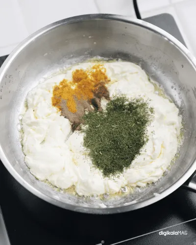 وقتی پنیر تفت خورد و کاملا نرم شد، شوید خشک، زردچوبه و فلفل سیاه را اضافه کنید و تفت دهید.