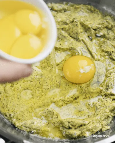 حالا تخممرغها را به تابه اضافه کنید و هم بزنید. در صورت نیاز کمی نمک به آن اضافه کنید.