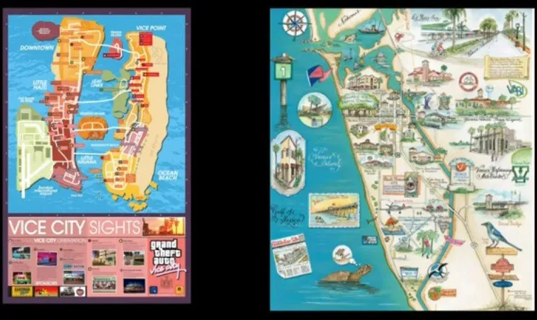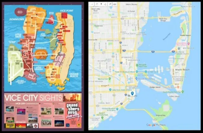 چپ: وایس سیتی، نسخهای خیالی از میامی. راست: میامی در دنیای واقعی