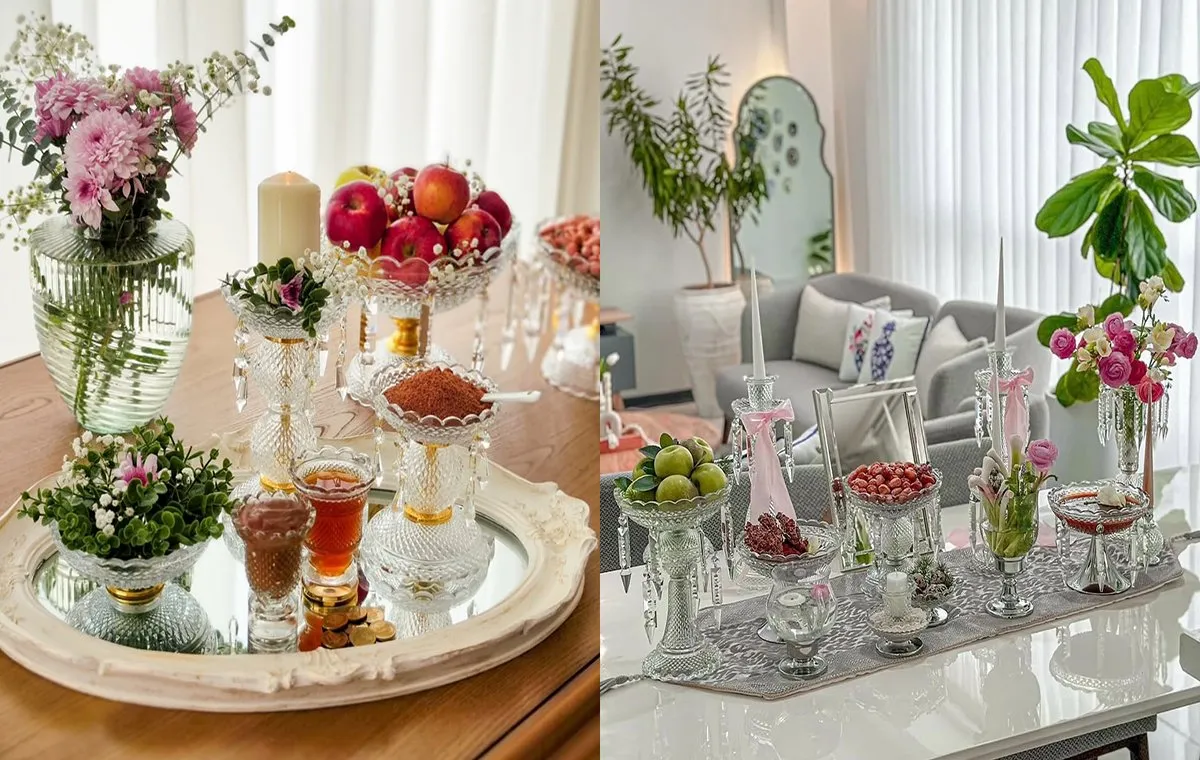 یکی از ترندترین و جدیدترین مدلهای سفره هفت سین 1404 که اگر کمی اهل گشت و گذار در شبکههای اجتماعی باشید آن را میشناسید، هفت سین باکارات است. این طرح هفت سین در ظروف شیشهای پایهدار و تزیین شده با کریستال چیده میشود که با نام باکارات معروف هستند. این ظروف را میتوانید در صورت تمایل در رنگهای مختلفی چون بنفش، آبی و سبز هم تهیه کنید تا حال و هوای متفاوتی را به مناسبت عید نوروز به خانهی خود ببخشید. سفره هفت سین باکارات با آینه و شمعدانهای شیشهای بلند، رومیزیهای سنتی و گلهای تازه جلوهی لاکچری و زیبایی پیدا میکنند؛ پس حتما آنها را در نظر داشته باشید.