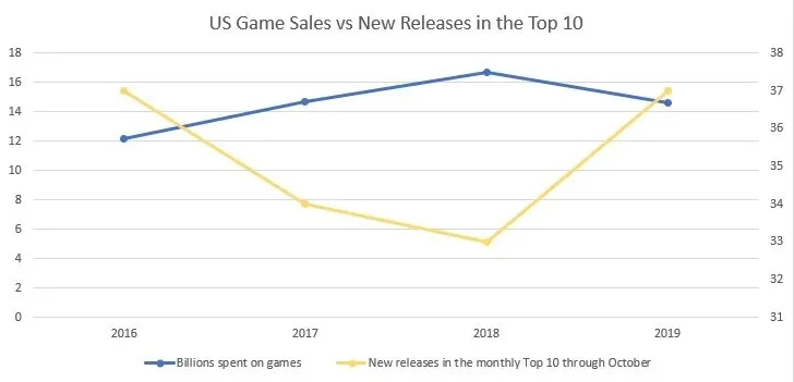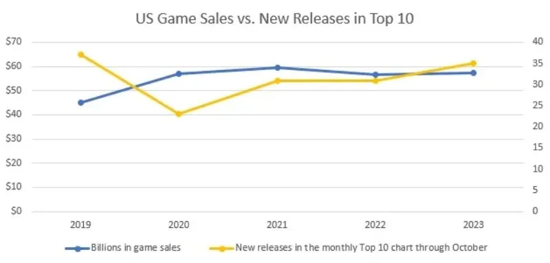 در آین آمار آمده که میانگین تعداد بازیهای جدید در نمودارهای 10 بازی پرفروش برتر در ده ماه اول سال یعنی از ابتدای سال تا ماه اکتبر از 2016 تا 2022، حدودا 32.3 بوده است. این در حالی است که این رقم برای ده ماههی اول سال 2023، 35 گزارش شده است. البته در این میان باید گفت که این تعداد برای سالهای 2016 تا 2019 حدودا 37 بوده است.