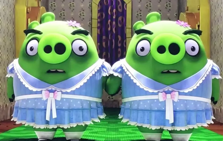 «درخشش» (The Shining) یکی از محبوبترین و پر ارجاعترین فیلمهای ترسناک تمام دوران است و در همین فهرست نام آن را چند بار دیگر خواهید شنید. «نسخهی سینمایی پرندگان خشمگین» هم از این قاعده مستثنا نیست و به داستان کلاسیک استیون کینگ گریزی میزند. ماجرا از این قرار است که قرمز به عنوان شخصیت اصلی بالاخره به قلعهی پادشاه خوکها راه پیدا میکند و در بدو ورود با دو خوک بانمک مواجه میشود که به سبک ارواح خواهران دوقلوی گریدی لباس پوشیدند اما ماجرا به همین جا ختم نمیشود و خوکها شروع به تکرار واژهی Redrum میکنند.