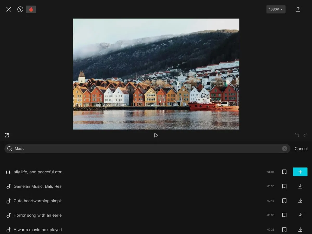 - در نوار جستوجو دنبال موسیقی مورد نظر بگردید و روی هر آهنگ ضربه بزنید تا ببینید کدام یک بیشتر با تصویر شما مطابقت دارد. وقتی از آهنگی راضی هستید، روی دکمهی + کنار آن ضربه بزنید.