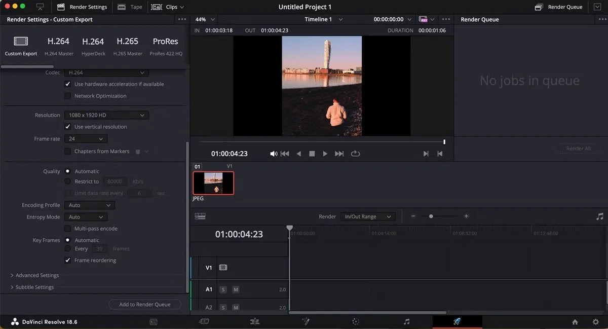 - برای ذخیرهی پروژه خود، به فضای کاری Deliver که با نماد موشک نشان داده شده است، بروید. محل ذخیرهی فایل را به همراه وضوح و تنظیمات دیگر انتخاب کنید. اگر از تصویر خود در رسانههای اجتماعی استفاده میکنید، به Resolution و سپس Custom بروید و از کیفیت 1080 در 1920 استفاده کنید.